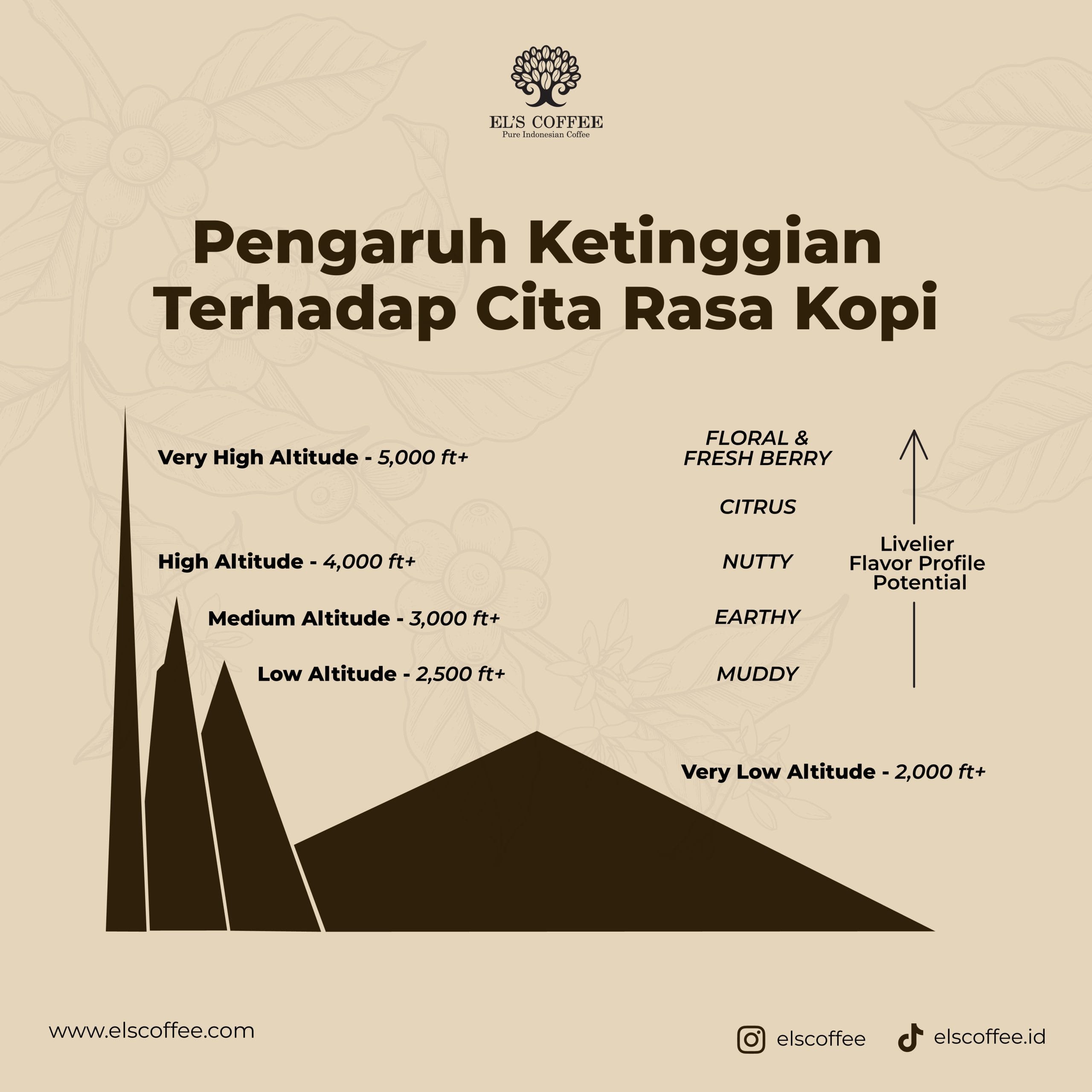 Ketinggian dimana tanaman kopi tumbuh akan memepengaruhi senyawa dan karakter rasa kopi. Semakin tinggi kopi ditanam, rasa yang dihasilkan akan semakin kompleks.